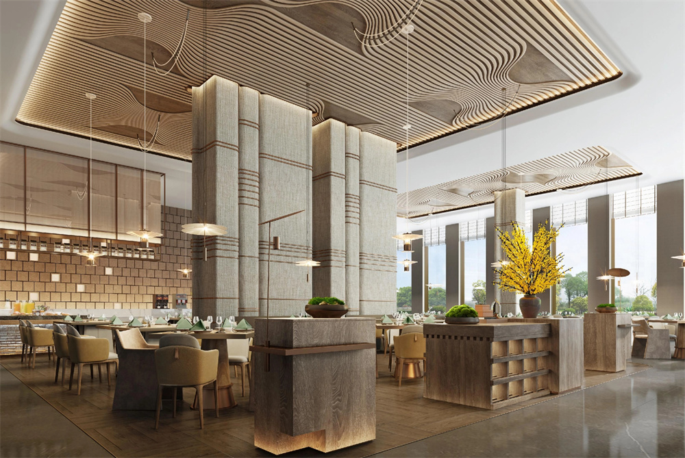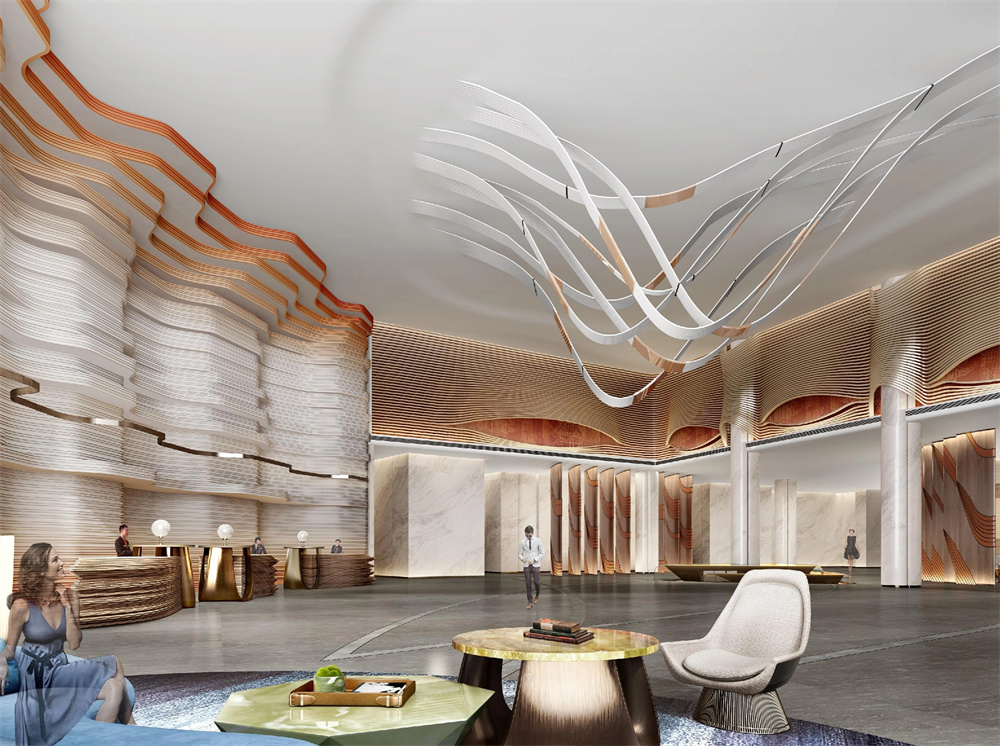 云南昭通高速鳳凰廣場酒店,設計靈感來源于鳳舞九天的靈動姿態,使用具有優美弧度的曲線設計元素,將自然靈動的線條貫穿室內空間,線條組合流動匯聚成面賦予空間生機,